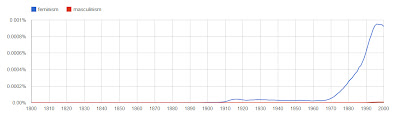You'll have to excuse the picture, but for whatever reason right clicking wouldn't work so I had to print screen it. I decided to look at the words "feminism" and "masculinism". As you would expect, in the early 20th Century "feminism" appears and suddenly explodes with the increase of new-wave feminists in the 1970s. Oddly, though "masculinism" stays at a fairly even level until the 1990s when there is a small clime. I can only assume this is a reaction to the success of women in liberating themselves.